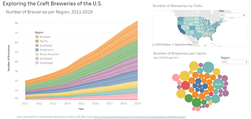 This dashboard was created to submit for the monthly Storytelling with Data Challenge to demonstrate there’s often more to data than meets the eye. To explore this challenge, I wanted to look at the rise in craft breweries in the U.S. over the last decade using data from the Brewers Association craft beer sales data. For the main visualization I chose to sort these into regions of the country in a stacked in the area chart from most craft breweries in 2019 to least – in the Tableau dashboard you can hover over each line and see the data for that state for a given year. I then built a choropleth map to show the number of craft breweries in each state, with darker colors indicating more breweries. Finally, I wanted to visualize the number of breweries per 100,000 residents of drinking age, shown in the bubble chart.