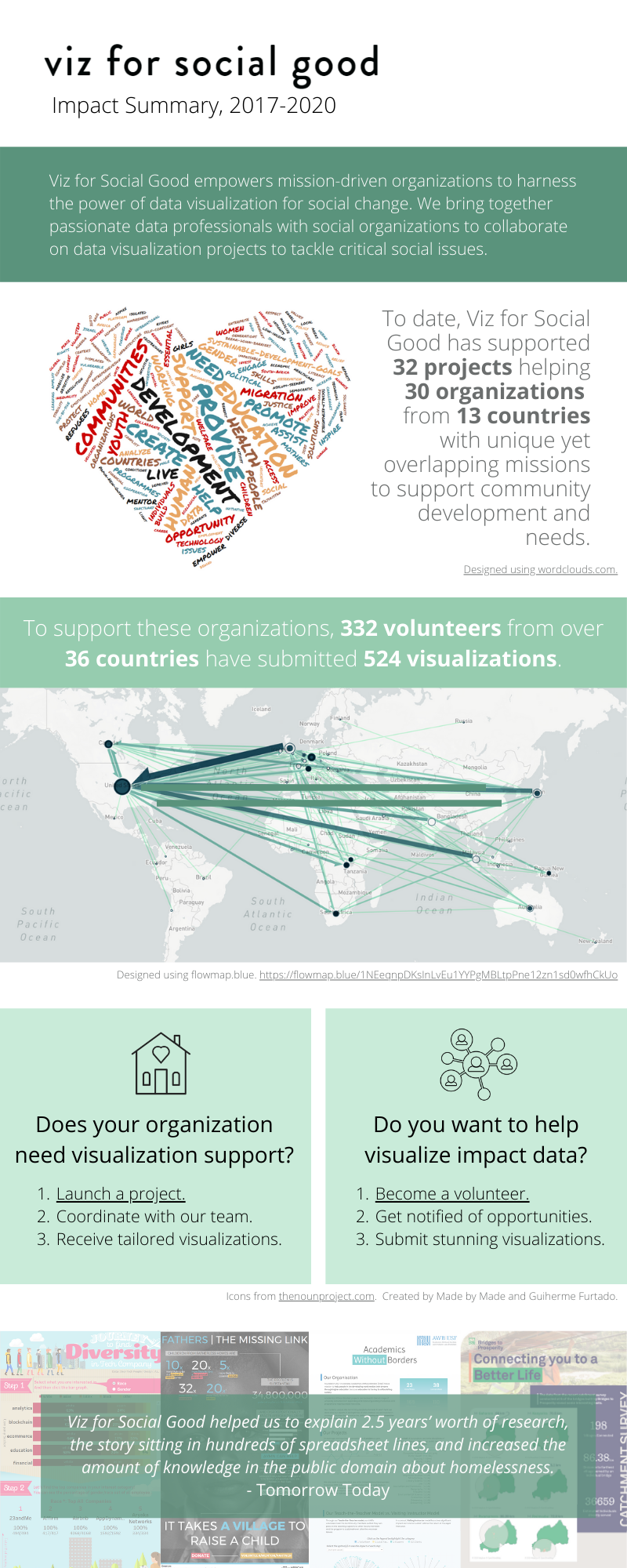 Viz for Social Good is a platform for nonprofit organizations to receive assistance in visualizing data. Volunteers from all over the world process, analyze, and visualize the data and submit visualizations to help the organization. The November 2020 project was to visualize the impact of the platform itself and encourage nonprofits and volunteers to connect.